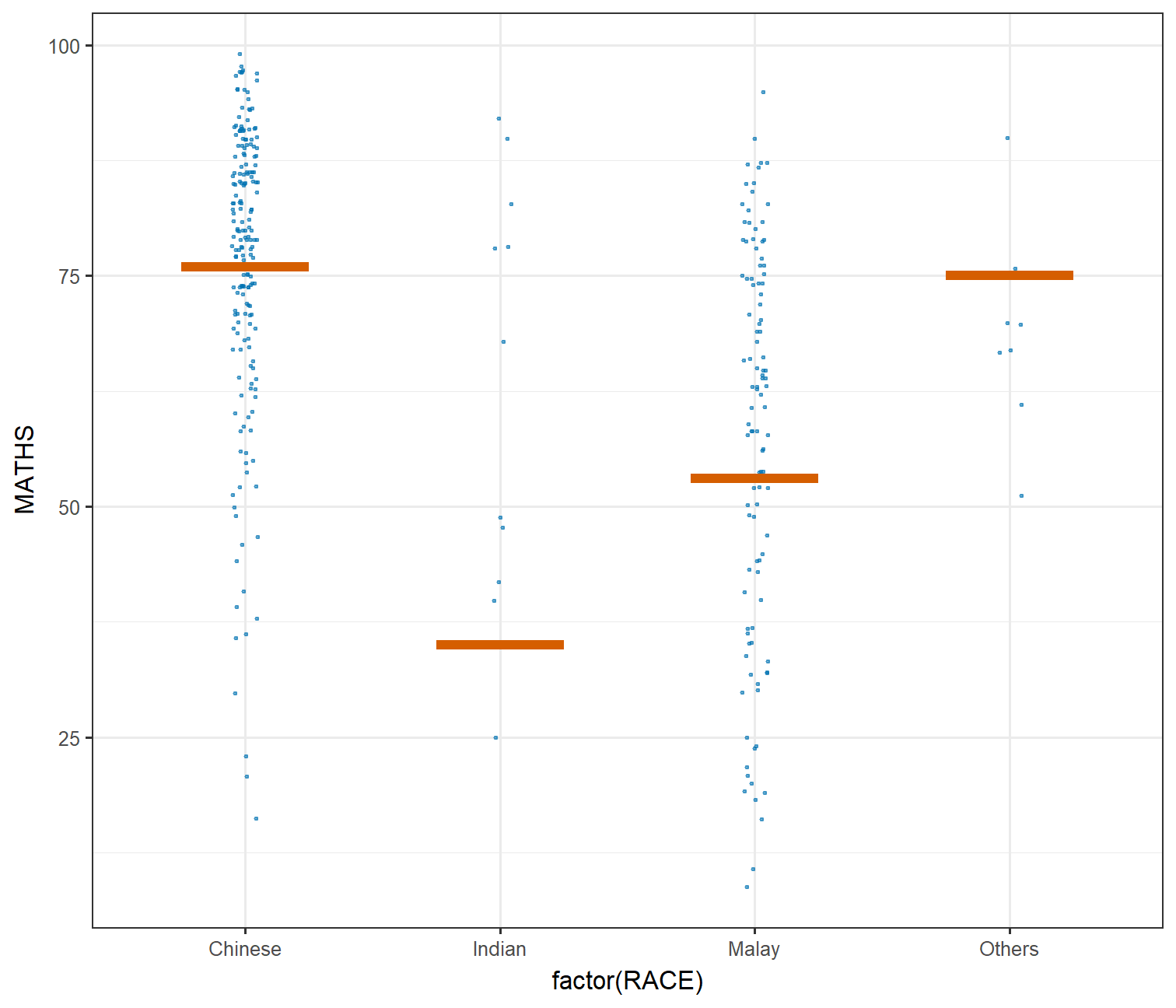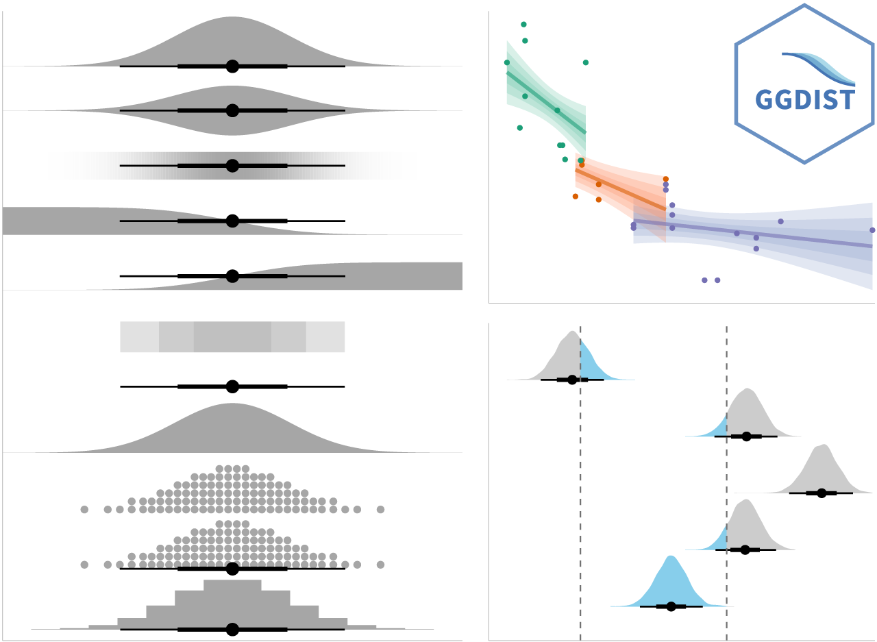 --- ### Visualizing the uncertainty of point estimates with interactive error bars The code chunk: ```r shared_df = SharedData$new(my_sum) bscols(widths = c(4,8), ggplotly((ggplot(shared_df) + geom_errorbar(aes(x=reorder(RACE, -mean), ymin=mean-2.58*se, ymax=mean+2.58*se), width=0.2, colour="black", alpha=0.9, size=0.5) + geom_point(aes (x=RACE, y=mean, text = paste("Race:", `RACE`,"<br>N:", `n`, "<br>Avg. Scores:", round(mean, digits = 2), "<br>95% CI:[", round((mean-2.58*se), digits = 2), ",", round((mean+2.58*se), digits = 2),"]")), stat="identity", color="red", size = 1.5, alpha=1) + xlab("Race") + ylab("Average Scores") + theme_minimal() + theme(axis.text.x = element_text(angle = 45, vjust = 0.5, hjust=1)) + ggtitle("99% Confidence interval of average /<br>maths scores by race")), tooltip = "text"), DT::datatable(shared_df, rownames = FALSE, class="compact", width="100%", options = list(pageLength = 8, scrollX=T), colnames = c("No. of pupils", "Avg Scores","Std Dev","Std Error")) %>% formatRound(columns=c('mean', 'sd', 'se'), digits=2) %>% DT::formatStyle(columns = c(1:5), width='10px') ) ``` --- ## Visualising Uncertainty: **ggdist** package .pull-left[ + [**ggdist**](https://mjskay.github.io/ggdist/index.html) is an R package that provides a flexible set of ggplot2 geoms and stats designed especially for visualising distributions and uncertainty. + It is designed for both frequentist and Bayesian uncertainty visualization, taking the view that uncertainty visualization can be unified through the perspective of distribution visualization: + for frequentist models, one visualises confidence distributions or bootstrap distributions (see vignette("freq-uncertainty-vis")); + for Bayesian models, one visualises probability distributions (see the tidybayes package, which builds on top of ggdist). ] .pull-right[  ] --- ### Visualizing the uncertainty of point estimates: **ggdist** methods .pull-left[ In the code chunk below, [`stat_pointinterval()`](https://mjskay.github.io/ggdist/reference/stat_pointinterval.html) of **ggdist** is used to build a visual for displaying distribution of maths scores by race. ```r exam %>% ggplot(aes(x = RACE, y = MATHS)) + * stat_pointinterval() + labs( title = "Visualising confidence intervals of mean math score", subtitle = "Mean Point + Multiple-interval plot") ``` Gentle advice: This function comes with many arguments, students are advised to read the syntax reference for more detail. ] .pull-right[ <img src="Hands-on_Ex04_files/figure-html/unnamed-chunk-38-1.png" width="504" /> ] --- ### Visualizing the uncertainty of point estimates: **ggdist** methods .pull-left[ **Exercise:** Makeover the plot on previous slide by showing 95% and 99% confidence intervals. ```r exam %>% ggplot(aes(x = RACE, y = MATHS)) + stat_pointinterval( show.legend = FALSE) + labs( title = "Visualising confidence intervals of mean math score", subtitle = "Mean Point + Multiple-interval plot") ``` Gentle advice: This function comes with many arguments, students are advised to read the syntax reference for more detail. ] .pull-right[ <img src="Hands-on_Ex04_files/figure-html/unnamed-chunk-40-1.png" width="504" /> ] --- ### Visualizing the uncertainty of point estimates: **ggdist** methods .pull-left[ In the code chunk below, [`stat_gradientinterval()`](https://mjskay.github.io/ggdist/reference/stat_gradientinterval.html) of **ggdist** is used to build a visual for displaying distribution of maths scores by race. ```r exam %>% ggplot(aes(x = RACE, y = MATHS)) + * stat_gradientinterval( * fill = "skyblue", * show.legend = TRUE * ) + labs( title = "Visualising confidence intervals of mean math score", subtitle = "Gradient + interval plot") ``` Gentle advice: This function comes with many arguments, students are advised to read the syntax reference for more detail. ] .pull-right[ <img src="Hands-on_Ex04_files/figure-html/unnamed-chunk-42-1.png" width="504" /> ] --- ## Visualising Uncertainty with Hypothetical Outcome Plots (HOPs) .pull-left[ Step 1: Installing ungeviz package ```r devtools::install_github("wilkelab/ungeviz") ``` Note: You only need to perform this step once. Step 2: Launch the application in R ```r library(ungeviz) ``` ] .pull-right[ <!-- --> ] --- ## Visualising Uncertainty with Hypothetical Outcome Plots (HOPs) .pull-left[ The code chunk: ```r ggplot(data = exam, (aes(x = factor(RACE), y = MATHS))) + geom_point(position = position_jitter( height = 0.3, width = 0.05), size = 0.4, color = "#0072B2", alpha = 1/2) + geom_hpline(data = sampler(25, group = RACE), height = 0.6, color = "#D55E00") + theme_bw() + transition_states(.draw, 1, 3) ``` ]