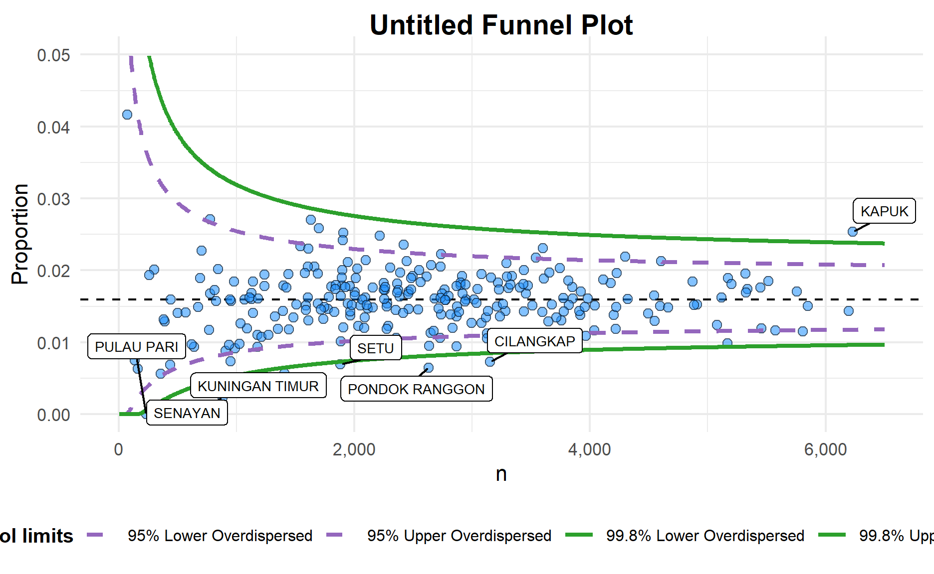 group in this function is different from the scatterplot. Here, it defines the level of the points to be plotted i.e. Sub-district, District or City. If Cityc is chosen, there are only six data points.data_typeargument is “SR”.limit: Plot limits, accepted values are: 95 or 99, corresponding to 95% or 99.8% quantiles of the distribution.The code chunk below plots a funnel plot.